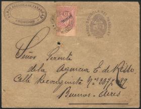 289 PARAGUAY - HISTORIA POSTAL Sobre / N°Cat.: MB. Sobre oficial del Banco Agrícola del Paraguay, franqueado con sello oficial de 10c. lila, enviado en ABR/1897 a Buenos Aires (marca de arribo al dorso). Son muy raros los sobres oficiales de Paraguay legítimamente circulados, con sellos de servicio oficial utilizados correctamente, y que no tengan como destinatario al Cónsul en Buenos Aires Alonso (que son sobres filatélicos). Precio inicial: US$ 150 Precio actual: US$ 150 Oferte US$ 150 o más | |