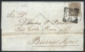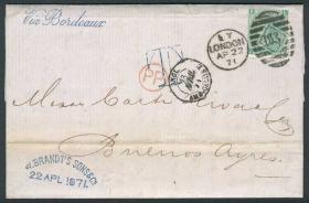 236 GRAN BRETAÑA - HISTORIA POSTAL Sobre / Usado N°Cat.: MB. 22/ABR/1871 LONDON - ARGENTINA: Carta completa franq. con Sc.54 plancha 4, con matasello duplex "103", enviada VÍA FRANCIA a Buenos Aires, con marcas de tránsito y multa, excelente calidad, rara! Precio inicial: US$ 100 Precio actual: US$ 100 Oferte US$ 100 o más | |