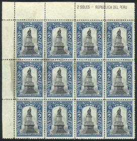 322 PERÚ - EMISIONES GENERALES Multiplo / Nuevo con bisagra N°Cat.: Sc.176 Valor de catál.: US$2.400+ Buena-MB Sc.176, 1907 2P. Monumento a Colón, bloque de 12 esquina de hoja, segunda pieza máxima conocida, nuevo con plena goma de origen, buena a MB calidad, valor de catálogo Scott US$2.400 (para 12 ejemplares sueltos), raro! Precio inicial: US$ 750 Precio actual: US$ 750 Oferte US$ 826 o más | |