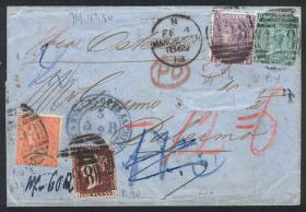 231 GRAN BRETAÑA - HISTORIA POSTAL Sobre / N°Cat.: Buena-MB 4/FEB/1869 Manchester - Palermo (Italia): Cubierta (con el apellido del detinatario recortado) con franqueo multicolor: 1p. carmín oscuro plancha 90 + 1S. verde plancha 4 + 6p. violeta plancha 6 + 4p. naranja plancha 10, todos matasellados con la marca duplex "Manchester - 498", "PD" en óvalos rojo (pagado hasta destino), tránsito por Aachen (color azul) y varias marcas manuscritas en crayón rojo y azul. Al dorso tránsitos por London, Basel, Napoli, y arribo el 11/FEB, muy atractivo e interesante! Precio inicial: US$ 350 Precio actual: US$ 350 Oferte US$ 350 o más | |