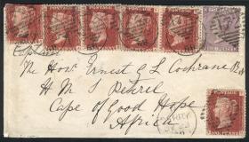 230 GRAN BRETAÑA - HISTORIA POSTAL Sobre / N°Cat.: Buena-MB 23/JUL/1868 Derry - Sudáfrica: Sobre enviado a: "Captain The Honr. Ernest G L Cochrane, HMS Petrel, Cape of Good Hope". El franqueo se pagó con SG.43 plancha 103 x6 + 104 pl.6 (el sello pegado en el extremo superior izquierdo se pegó doblado hacia atrás para dejar libre la dirección), cada sello está matasellado con un duplex "Derry - 172", al dorso tránsito por London. Es un sobre muy atractivo, transportado por la Union Steamship Company en la inauguración del período del 3º contrato en julio de 1868. NOTA: El anterior propietario pagó por esta carta £350 en Stanley Gibbons de London aproximadamente en el año 2000, oportunidad por su baja base! Precio inicial: US$ 200 Precio actual: US$ 200 Oferte US$ 200 o más | |
