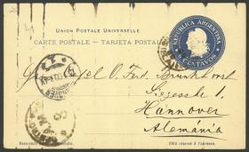 1000 ARGENTINA - ENTEROS POSTALES / N°Cat.: TAR-26 Valor de catál.: US$ 10 Buena TAR-26, Tarjeta de 6c. enviada desde Bs As a Hannover (Alemania) el 22 de Diciembre 1899, con matasello de arribo Precio inicial: US$ 5 Precio actual: US$ 5 Oferte US$ 5 o más