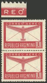 818 ARGENTINA - CORREO AÉREO Pareja / Nuevo Mint N°Cat.: GJ.1340 MB. GJ.1340, pareja con VARIEDAD : color ultramar retintado al dorso Precio inicial: US$ 20 Precio actual: US$ 20 Oferte US$ 20 o más