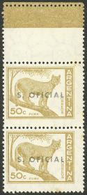 914 ARGENTINA - OFICIALES Pareja / Nuevo con bisagra N°Cat.: MB. COMPLEMENTO NO CATALOGADO, Puma ( pareja ) impresa en papel nacional con complemento arriba, raro!!!! Precio inicial: US$ 25 Precio actual: US$ 25 Oferte US$ 28 o más