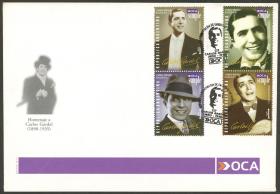 950 ARGENTINA - CORREOS PRIVADOS Sobre / Usado N°Cat.: MB. Homenaje a Carlos Gardel ( cantante ) : serie completa ( 4 v. ) del correo OCA en atractivo sobre primer día Precio inicial: US$ 5 Precio actual: US$ 5 Oferte US$ 5 o más