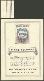 827 ARGENTINA - BLOCKS Bloque conmemorativo / Nuevo Mint N°Cat.: GJ.09 Valor de catál.: US$ +20 MB. GJ.09, 5c + $1, Emitido en Beneficio de las Provincias de Catamarca y La Rioja ( himno + bandera ), con VARIEDAD : retoque ( NO catalogado ) en las 5 líneas del marco derecho, MB!! Precio inicial: US$ 20 Precio actual: US$ 20 Oferte US$ 20 o más