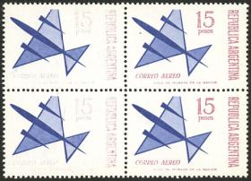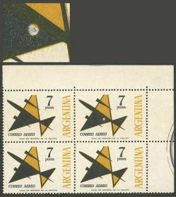 814 ARGENTINA - CORREO AÉREO Cuadro / Nuevo Mint N°Cat.: GJ.1252 MB. GJ.1252, $7 Avión estilizado con " ARGENTINA " hacia arriba, cuadro EdH con VARIEDADES, el sello superior derecho : ala rota + los 2 sellos derechos : con DOBLE IMPRESIÓN del color negro, raro!!! Precio inicial: US$ 50 Precio actual: US$ 50 Oferte US$ 50 o más