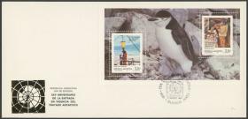 832 ARGENTINA - BLOCKS Bloque conmemorativo / Usado N°Cat.: GJ.50 Valor de catál.: 8,5 MB. GJ.50, ( fauna Antártica + pioneros ), en sobre primer día Precio inicial: US$ 5 Precio actual: US$ 5 Oferte US$ 6 o más