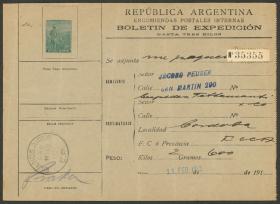 957 ARGENTINA - ENTEROS POSTALES Entero postal / Usado N°Cat.: BEE-3 Valor de catál.: US$ 35 Buena-MB BEE-3, Boletín de Expedición de encomienda hasta tres kilos, de 80c Labrador, usado en Bs As el 11 de Febrero de 1913 Precio inicial: US$ 20 Precio actual: US$ 20 Oferte US$ 20 o más