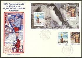 838 ARGENTINA - BLOCKS Bloque conmemorativo / Usado N°Cat.: GJ.57 Valor de catál.: 6,5 MB. GJ.57, XXV ° Aniversario de la Entrada en Vigencia del Tratado Antártico, en tarjeta PDE ( primer día de emisión) Precio inicial: US$ 4 Precio actual: US$ 4 Oferte US$ 4 o más