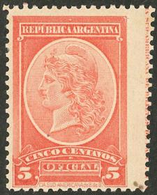 864 ARGENTINA - OFICIALES Sello suelto / Nuevo con bisagra N°Cat.: GJ.48 MB. GJ.48, dentado 11½ x 12¼, con VARIEDAD : dentado vertical derecho desplazado y diagonal ( sello MUCHO MÁS ANCHO de lo normal, parte de la leyenda del impresor queda dentro del margen ) Precio inicial: US$ 10 Precio actual: US$ 10 Oferte US$ 10 o más