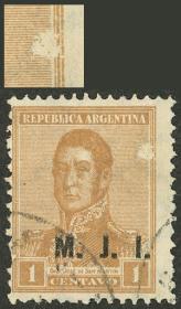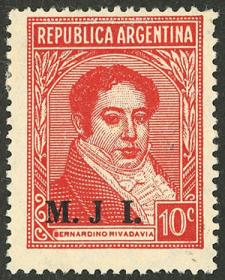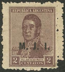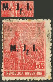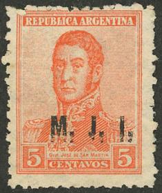 887 ARGENTINA - OFICIALES Sello suelto / Sin usar (sin goma) N°Cat.: GJ.448 MB. GJ.448, con VARIEDAD : " M.J I. " ( " J " sin punto ), raro Precio inicial: US$ 15 Precio actual: US$ 15 Oferte US$ 15 o más