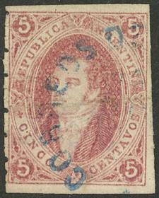 81 ARGENTINA - RIVADAVIAS Sello suelto / Usado N°Cat.: GJ.25A Valor de catál.: US$250+300% Buena-MB GJ.25A, 4ª Tirada color rosa violáceo oscuro con el rarísimo matasello "CORREOS DE SAN GERÓNIMO" en color azul (+300%), MB! Precio inicial: US$ 250 Precio actual: US$ 250 Oferte US$ 250 o más