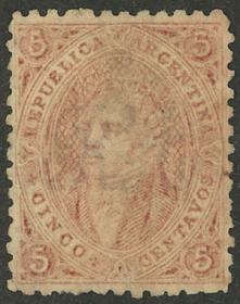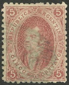 74 ARGENTINA - RIVADAVIAS Sello suelto / Usado N°Cat.: GJ.25a MB. GJ.25a, 4ª Tirada con DOBLE IMPRESIÓN total (muy separadas entre sí, impresionante!), con un lindo color rosa oscuro, ejemplar de lujo, raro así! Precio inicial: US$ 50 Precio actual: US$ 50 Oferte US$ 50 o más