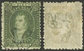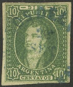 41 ARGENTINA - RIVADAVIAS Sello suelto / Usado N°Cat.: GJ.23 MB. GJ.23, 10c. Verde oscuro, impresión borrosa, con matasello mudo "ponchito" en negro (+300%), magnífico! Precio inicial: US$ 60 Precio actual: US$ 60 Oferte US$ 60 o más
