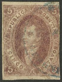 91 ARGENTINA - RIVADAVIAS Sello suelto / Usado N°Cat.: GJ.26a Valor de catál.: US$240 MB. GJ.26a, 5ª Tirada con var. DOBLE IMPRESIÓN TOTAL bien notable, usado en Córdoba, calidad lujo, raro! Precio inicial: US$ 200 Precio actual: US$ 200 Oferte US$ 200 o más