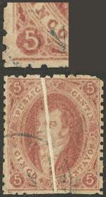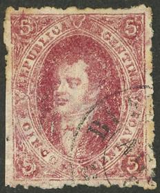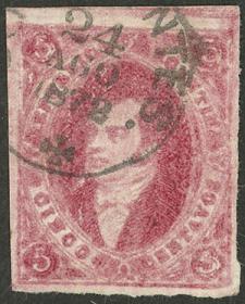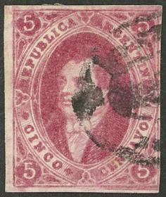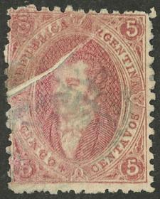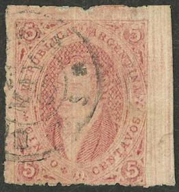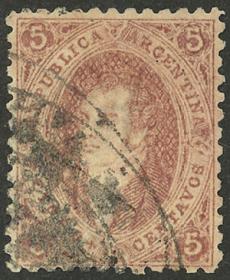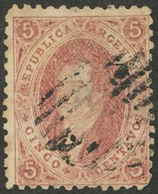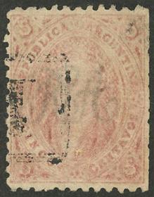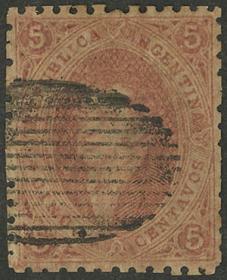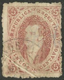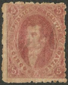 74 ARGENTINA - RIVADAVIAS Sello suelto / Usado N°Cat.: GJ.25a MB. GJ.25a, 4ª Tirada con DOBLE IMPRESIÓN total (muy separadas entre sí, impresionante!), con un lindo color rosa oscuro, ejemplar de lujo, raro así! Precio inicial: US$ 50 Precio actual: US$ 50 Oferte US$ 50 o más