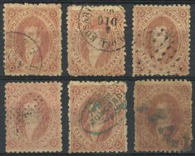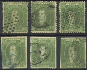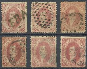 38 ARGENTINA - RIVADAVIAS Lote / Usado N°Cat.: GJ.21, 23 Valor de catál.: US$180++ MB. GJ.23, 10c. Verde, lote de 6 ejemplares usados, impresiones desde nítidas a muy borrosas, todos los matasellos son diferentes, muy buena calidad! Precio inicial: US$ 120 Precio actual: US$ 120 Oferte US$ 120 o más