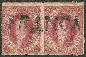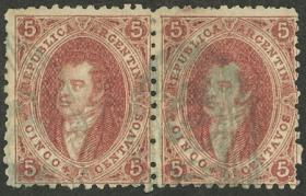 7 ARGENTINA - RIVADAVIAS Pareja / Usado N°Cat.: GJ.19 MB. GJ.19, 1ª Tirada nítida, color rojo rosa fuerte, magnífica pareja de lujo, matasello OM azul verdoso, fresca, perfecta, excelente! Precio inicial: US$ 100 Precio actual: US$ 100 Oferte US$ 100 o más