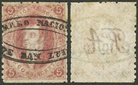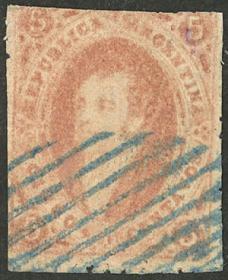 101 ARGENTINA - RIVADAVIAS Sello suelto / Usado N°Cat.: GJ.28Aa Valor de catál.: US$240++ MB. GJ.28Aa, 6ª Tirada dentada, color rojo pardo anaranjado e impresión borrosa, magnífico ejemplar con un matasello mudo de NOGOYÁ "10 barras formando una elipse" en color AZUL (único conocido así!), excelente y rarísimo! Precio inicial: US$ 300 Precio actual: US$ 300 Oferte US$ 300 o más