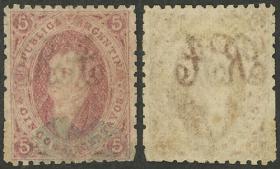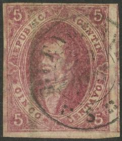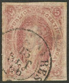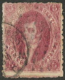 76 ARGENTINA - RIVADAVIAS Sello suelto / Usado N°Cat.: GJ.25e MB. GJ.25e, 4ª Tirada con var. PLANCHA RAYADA, usado en Bs.Aires el 15/SEP/1866, ejemplar de super lujo! Precio inicial: US$ 25 Precio actual: US$ 25 Oferte US$ 25 o más