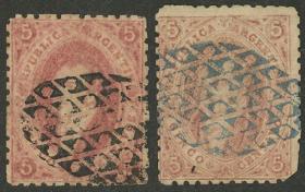 5 ARGENTINA - RIVADAVIAS Lote / Usado N°Cat.: GJ.19+20 Valor de catál.: US$125 MB. GJ.19 + 20, 1ª o 2ª y 3ª Tiradas, con matasellos mudos de LA PAZ en colores negro y azul respectivamente (+150%), MB y muy atractivos! Precio inicial: US$ 65 Precio actual: US$ 65 Oferte US$ 65 o más