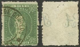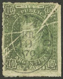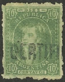 47 ARGENTINA - RIVADAVIAS Sello suelto / Usado N°Cat.: GJ.23g MB. GJ.23g, 10c. Verde impresión borrosa, MULATO y con desgastes de plancha (lamparones blancos), con un lindo matasello "CERTIFICADO", magnífico! Precio inicial: US$ 100 Precio actual: US$ 100 Oferte US$ 100 o más