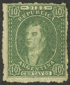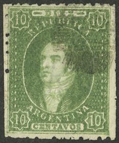 41 ARGENTINA - RIVADAVIAS Sello suelto / Usado N°Cat.: GJ.23 MB. GJ.23, 10c. Verde oscuro, impresión borrosa, con matasello mudo "ponchito" en negro (+300%), magnífico! Precio inicial: US$ 60 Precio actual: US$ 60 Oferte US$ 60 o más