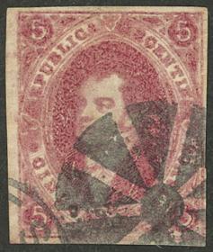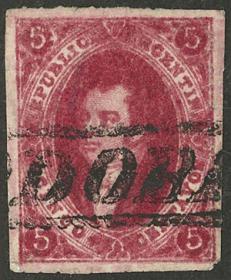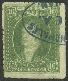 10 ARGENTINA - RIVADAVIAS Sello suelto / Usado N°Cat.: GJ.19 MB. GJ.19, 1ª o 2ª Tiradas, con matasello de SAN NICOLÁS doble ojiva (muy escaso), calidad lujo! Precio inicial: US$ 50 Precio actual: US$ 50 Oferte US$ 50 o más