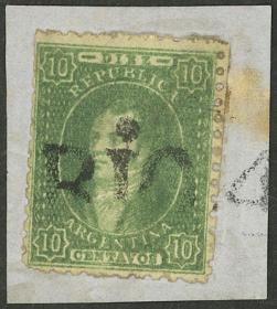 44 ARGENTINA - RIVADAVIAS Pieza / Usado N°Cat.: GJ.23 MB. GJ.23, 10c. Verde intenso, impresión semiborrosa, sobre fragmento con matasello lineal "RIO 4º" (+150%), muy buena calidad! Precio inicial: US$ 60 Precio actual: US$ 60 Oferte US$ 60 o más