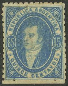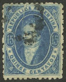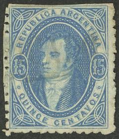 57 ARGENTINA - RIVADAVIAS Pieza / Usado N°Cat.: GJ.24 var. MB. GJ.24, 15c. Azul IMPRESIÓN SECA (poca tinta arriba), usado en Rosario, excelente calidad! Precio inicial: US$ 60 Precio actual: US$ 60 Oferte US$ 60 o más