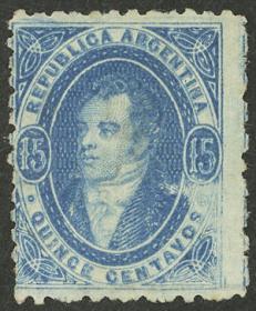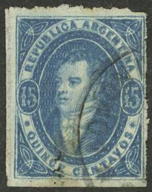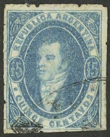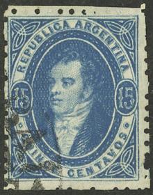 53 ARGENTINA - RIVADAVIAS Sello suelto / Usado N°Cat.: GJ.24 Valor de catál.: US$70++ MB. GJ.24, 15c. Azul oscuro, impresión seminítida, ejemplar de gran lujo, apenas matasellado, uno de los mejores en existencia! Precio inicial: US$ 70 Precio actual: US$ 70 Oferte US$ 70 o más