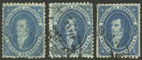 59 ARGENTINA - RIVADAVIAS Lote / Usado N°Cat.: GJ.24A Valor de catál.: US$270 MB. GJ.24A, 15c. Impresión borrosa, 3 ejemplares en colores azul verdoso, pizarra, e índigo, buenos matasellos, excelente calidad! Precio inicial: US$ 180 Precio actual: US$ 180 Oferte US$ 180 o más