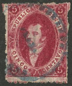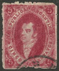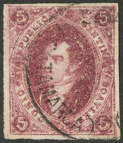 6 ARGENTINA - RIVADAVIAS Sello suelto / Usado N°Cat.: GJ.19 MB. GJ.19, 1ª Tirada o 2ª Tiradas con doble obliteración: Pluma y fechador de la mensajería "Ns. PENINSULARES", excelente calidad, raro!! Precio inicial: US$ 100 Precio actual: US$ 100 Oferte US$ 100 o más
