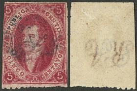 16 ARGENTINA - RIVADAVIAS Sello suelto / Usado N°Cat.: GJ.19e Valor de catál.: US$63 MB. GJ.19, 2ª Tirada impreso en PAPEL MUY DELGADO, usado en San Luis (+75%), lujo! Precio inicial: US$ 35 Precio actual: US$ 35 Oferte US$ 35 o más