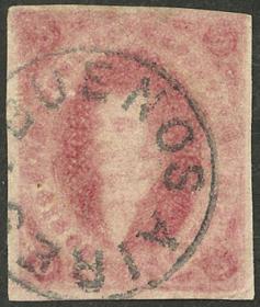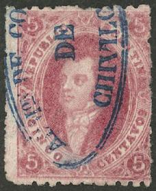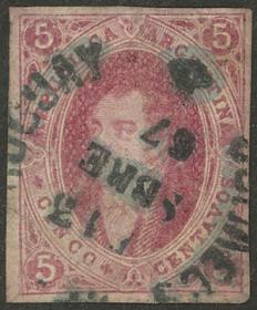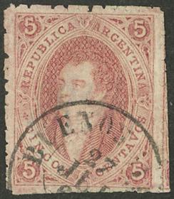 105 ARGENTINA - RIVADAVIAS Sello suelto / Usado N°Cat.: GJ.32 Valor de catál.: US$120+++ MB. GJ.32, 7ª Tirada sin dentar color rosa carmín oscuro, con matasello "ESTAFETA DE PILCIAO - CATAMARCA" (+600%), excelente calidad, muy raro! Precio inicial: US$ 200 Precio actual: US$ 200 Oferte US$ 200 o más