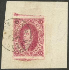 106 ARGENTINA - RIVADAVIAS Pieza / Usado N°Cat.: GJ.32 Valor de catál.: US$120+ MB. GJ.32, 7ª Tirada sin dentar con márgenes muy amplios a enormes (roba parte de los sellos vecinos superior e inferior), sobre fragmento con matasello fechador de Buenos Aires del 29/JUL/1867, lujo! Precio inicial: US$ 150 Precio actual: US$ 150 Oferte US$ 150 o más