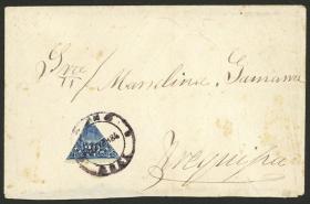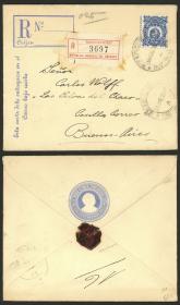 373 URUGUAY - HISTORIA POSTAL Sobre / N°Cat.: MB. Sobre (EP) de 5c. con error ortográfico "CENTECIMOS" + 40c. adicionales al dorso (pareja Sc.38) enviado certificado el 5/ABR/1874 de MERCEDES a Montevideo, excelente calidad, raro, ex-Loeb (su precio de venta: US$3.500) Precio inicial: US$ 2500 Precio actual: US$ 2500 Oferte US$ 2750 o más | |