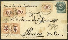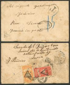 305 PERÚ - HISTORIA POSTAL Sobre / N°Cat.: Buena-MB Sobre enviado en 1877 a Italia con franqueo de 10c. con matasello de TACNA, enviado por correo inglés (tránsito por London el 1/MAR/1877), al llegar a destino en Picerno le aplicaron sellos de tasa italianos por 2,30L., muy atractivo! Precio inicial: US$ 200 Precio actual: US$ 200 Oferte US$ 221 o más | |