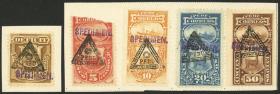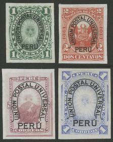 295 PERÚ - SELLOS DE TASA Serie / Sin usar (sin goma) N°Cat.: Sc.J22/26 MB. Sc.J22/J26, 1884 Serie completa de 5 valores sobrecargadas con un triángulo (el 5c. defectuoso), con sobrecargas SPECIMEN aplicadas en el correo de Natal luego de recibirlas como muestra desde la UPU, rarísimas y únicas. NOTA: El correo de Natal adhería en hojas de album los sellos que recibía como muestras desde la UPU y a todos les aplicaba estas sobrecargas manuales, cada estampilla así sobrecargada es única e irrepetible. INCLUÍMOS UN CERTIFICADO de las B.P.A. hecho para varios sellos, incluyendo estos Precio inicial: US$ 200 Precio actual: US$ 200 Oferte US$ 221 o más | |