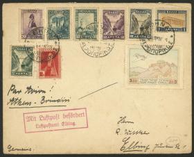 212 GRECIA - HISTORIA POSTAL Sobre / N°Cat.: Buena Sobre aéreo enviado el 30/MAR/1935 a Argentina con buen franqueo de 78d. incluyendo Sc.C21 (1933 50d., valor alto de la serie), enviado vía Alemania DLH, con arribo a Buenos Aires el 11/ABR, defectito de apertura en una esquina, muy atractivo! Precio inicial: US$ 75 Precio actual: US$ 75 Oferte US$ 83 o más | |