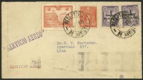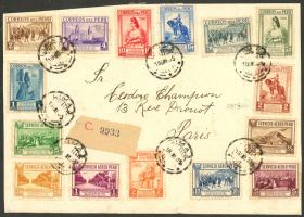 277 PERÚ - EMISIONES GENERALES Sobre / N°Cat.: Sc.324/31+C6/12 MB. Sc.324/331 + C6/12, 1935 4º Centenario de la fundación de Lima, la serie completa de 15 valores en un sobre certificado enviado a Francia, al dorso tiene marcas de tránsito por Cristobal, New York y arribo a Paris el 31/ENE, muy atractivo! Precio inicial: US$ 200 Precio actual: US$ 200 Oferte US$ 221 o más | |