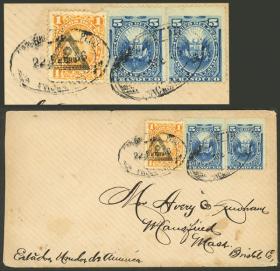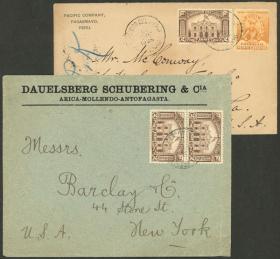 323 PERÚ - HISTORIA POSTAL Sobre / N°Cat.: MB. Sobre enviado el 19/DIC/1898 de Pacasmayo a USA con tarifa de 22c. (doble porte), al dorso tienen tránsito por Paita y arribo a destino + otro sobre con tarifa reducida de papeles de negocio enviado a New York con 4c. (pareja Sc.155), ambos de muy buena calidad! Precio inicial: US$ 100 Precio actual: US$ 100 Oferte US$ 111 o más | |