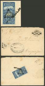267 PERÚ - EMISIONES GENERALES Pieza / Usado N°Cat.: Sc.77+69 pareja MB. Sc.77, 1883 50c. con doble sobrecarga: "PLATA-PERU" en rojo y triángulo en negro + pareja de 10c. con sobrecarga triángulo, en un fragmento de carta certificada de cuádruple porte enviada desde Trujillo a Lima (40c. de porte + 30c. de certificación), MB calidad, raro! Precio inicial: US$ 200 Precio actual: US$ 500 Oferte US$ 550 o más | |