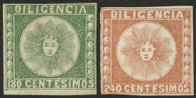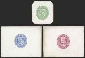 369 URUGUAY - ENTEROS POSTALES Lote / N°Cat.: MB. Pruebas de cuño de los sellos para sobres emitidos en 1866 con error ortográfico (CENTECIMOS), 5c. en los colores celeste oscuro y rojo rosa + 10c. en color verde, los 3 de excelente calidad, raro conjunto! Precio inicial: US$ 400 Precio actual: US$ 400 Oferte US$ 441 o más | |