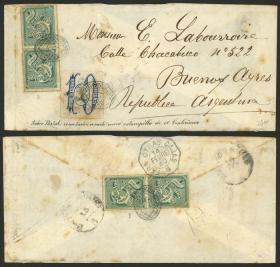 313 PERÚ - HISTORIA POSTAL Sobre / N°Cat.: Buena-MB Sobre enviado desde Buenos Aires a Lima el 1/DIC/1893 originalmente franqueada, con leyenda al dorso, sobre la solapa: "Sacada del buzón con señal de haber tenido estampillas y sucia, J. Piñeiro" y por este motivo circuló hasta Lima con tránsito por Valparaíso el 6/DIC, y al llegar a Lima la multaron con 15c. (Sc.J23 + J24), muy interesante, ex-Herbert Moll. Precio inicial: US$ 250 Precio actual: US$ 303 Oferte US$ 334 o más | |