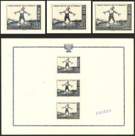 282 PERÚ - EMISIONES GENERALES Serie / N°Cat.: Sc.519+C246/7 MB. Sc.519 + C246/7, 1969 Reforma agraria, serie completa de 3 valores, PRUEBAS fotográficas en negro + tarjeta con la emisiones definitiva con matasellos PDE, muy atractivo conjunto! Precio inicial: US$ 100 Precio actual: US$ 100 Oferte US$ 111 o más | |