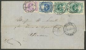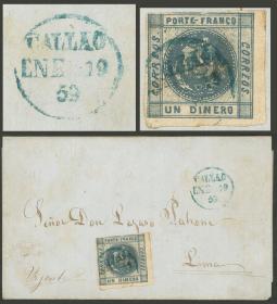 306 PERÚ - HISTORIA POSTAL Sobre / N°Cat.: MB. Carta completa enviada el 25/JUN/1879 (SOLO 8 DÍAS DESPUÉS DEL INGRESO DE PERÚ A LA UPU) desde Callao a Francia con la nueva tarifa al exterior de 27c., con tránsito por Calais el 28/JUL y al dorso arribo a Bordeaux al día siguiente, excelente calidad, ex-Herbert Moll. La nueva tarifa postal para cartas hacia Europa era de 11c. (de los cuales 1c. se destinaba a pagar el tránsito por el Istmo de Panamá). Este valor estaba expresado en Moneda de Plata para lo cual no existían aún estampillas, y el equivalente en Papel Moneda era 27c. o 30c., coincidiendo ésto con el inicio de la guerra con Chile en 1879. En 1880 las estampillas se sobrecargaron "Unión Postal Universal Plata Perú" y debían ser pagadas en metálico! Precio inicial: US$ 500 Precio actual: US$ 500 Oferte US$ 500 o más | |