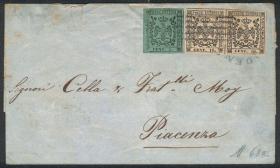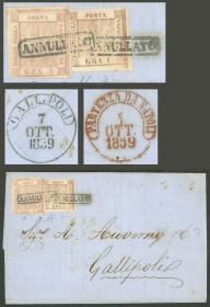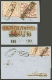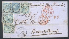 229 ITALIA - HISTORIA POSTAL Sobre / N°Cat.: MB. 2/FEB/1866 MENAGGIO - Argentina: Carta completa franq. con Sc.34b (Sa.23) x5, con mat. fechador de Menaggio, enviada por correo inglés a Bs.Aires, muy raro franqueo múltiple, gran cantidad de marcas postales al frente y dorso, carta espectacular! Precio inicial: US$ 1500 Precio actual: US$ 1500 Oferte US$ 1500 o más | |