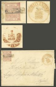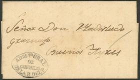 262 PARAGUAY - HISTORIA POSTAL Sobre / N°Cat.: MB. Carta completa enviada el 10/OCT/1859 a Buenos Aires, con la marca "ADMon GRAL DE CORREOS DE LA R. DEL P." en óvalo negro perfectamente colocada, excelente calidad! NOTA: Esta marca se ve generalmente sobre cubiertas sin fecha, es bastante escasa sobre cartas completas. Precio inicial: US$ 100 Precio actual: US$ 100 Oferte US$ 100 o más | |